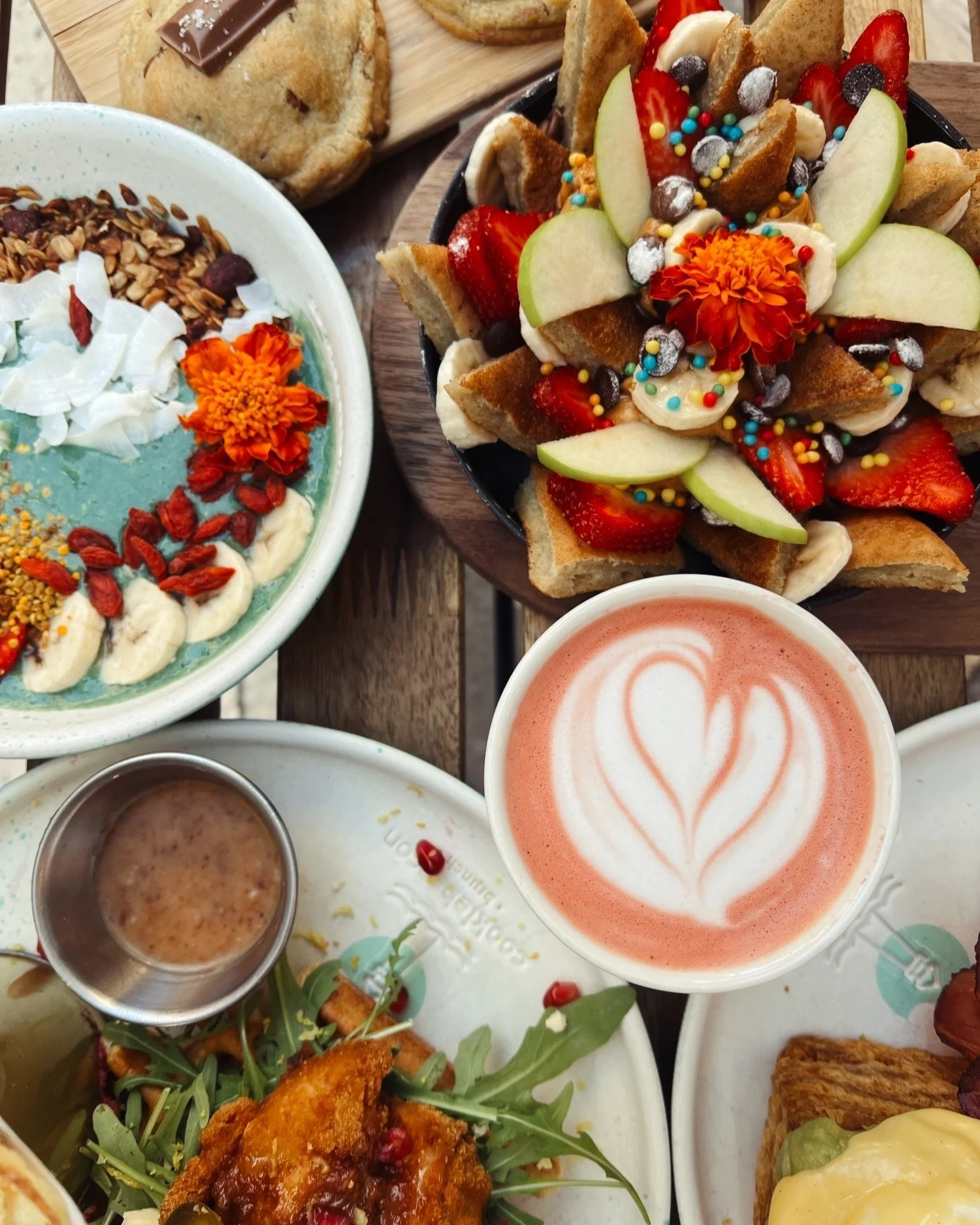 A table filled with brunch dishes from the best brunch spot in Budapest, Bucharest and Belgrade. It includes chunky cookies, eggs Benedict, vegan carrot cake pancakes, specialty coffee