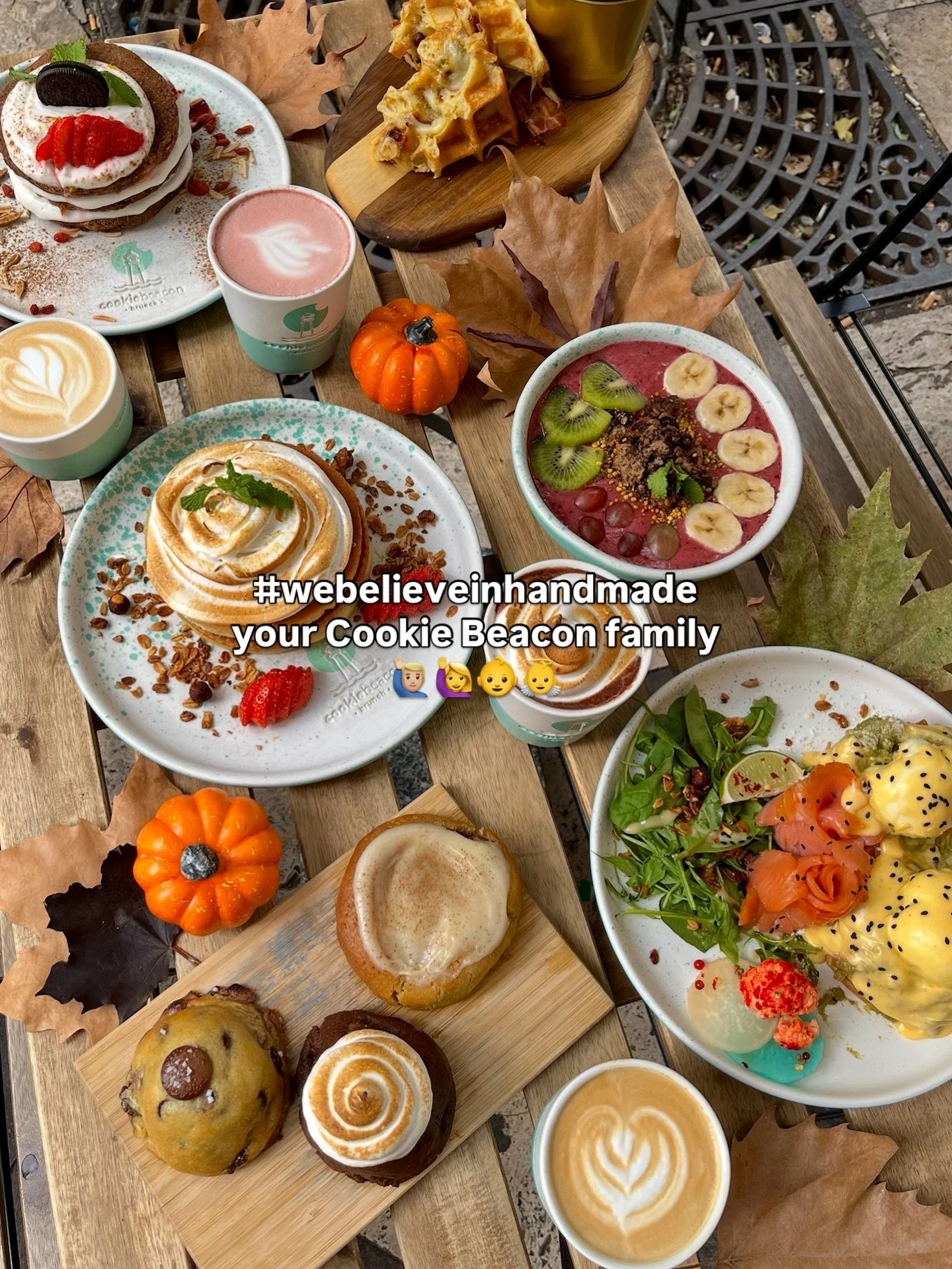 Autumn-themed breakfast spread from best brunch spot in budapest, Cookie Beacon, with pancakes, eggs Benedict, chunky cookies, coffee, fruit, salad, and small pumpkins on a wooden table decorated with fall leaves